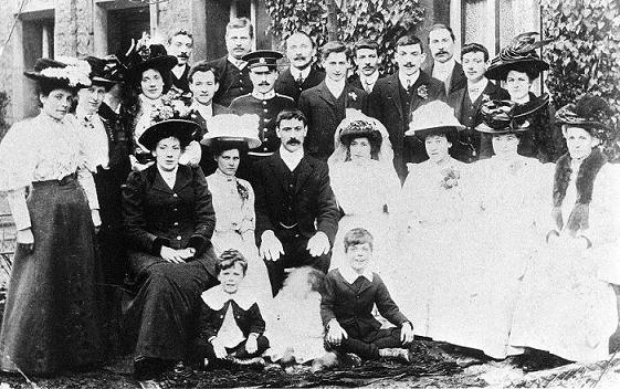 Nell Bisley (C), Mrs Ernest Collett, Groom, Bride, Lily Collett, Mabel Collett,